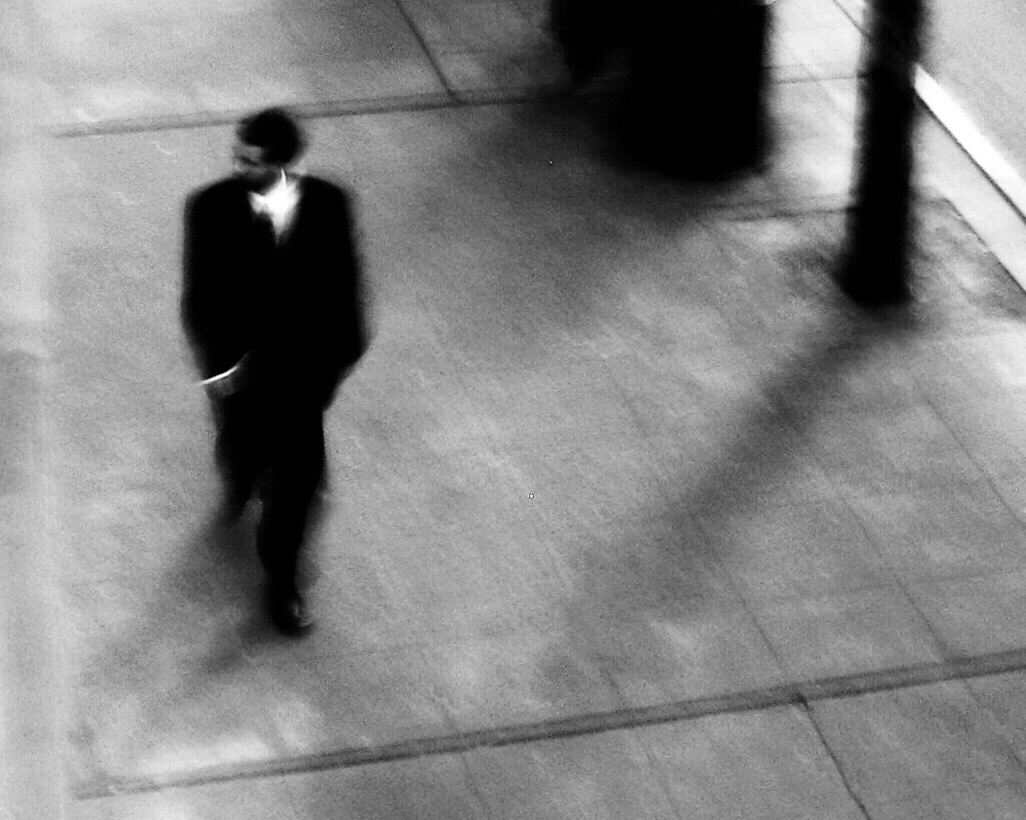 Something catches his attention. The swivel of his head towards the unseen (for me, at least) catches my attention. The shutter clicks, and I’m aware I’ve caught a security guard’s attention. Then the strolling man pauses to glance around, as if he can feel this concentrated beam of attention — from guard to me to him — from three floors up.
