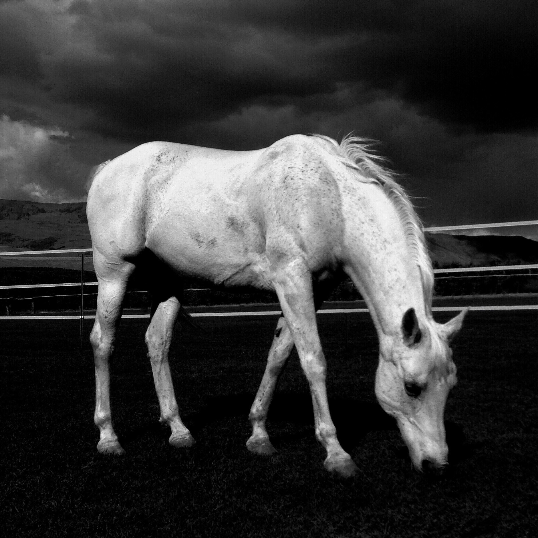 The fist flies in an arc only to stop a quarter-inch from the kung fu master’s face. He never flinches, for there’s nothing to fear. He lives in the moment, and in that moment the punch did not connect. The horse Stella stands in similar fashion: feet on ground, nose to grass, aware of the approaching storm but not panicky. Her present moment unfolds calmly with no alarm. Something bad might happen, but not just yet.