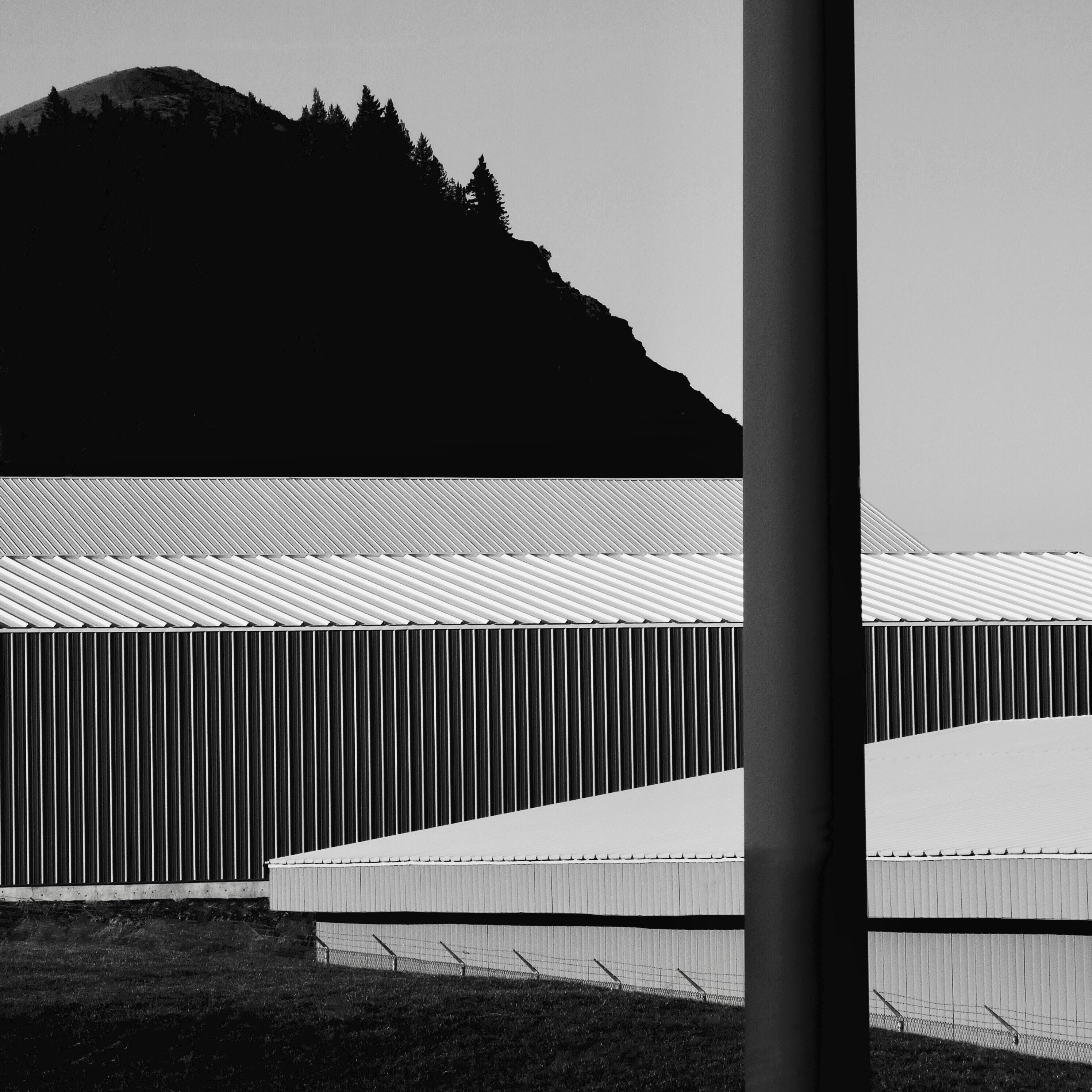 (This looks like a line drawing, but it really is a photo of a pole, some warehouses and a foothill.)