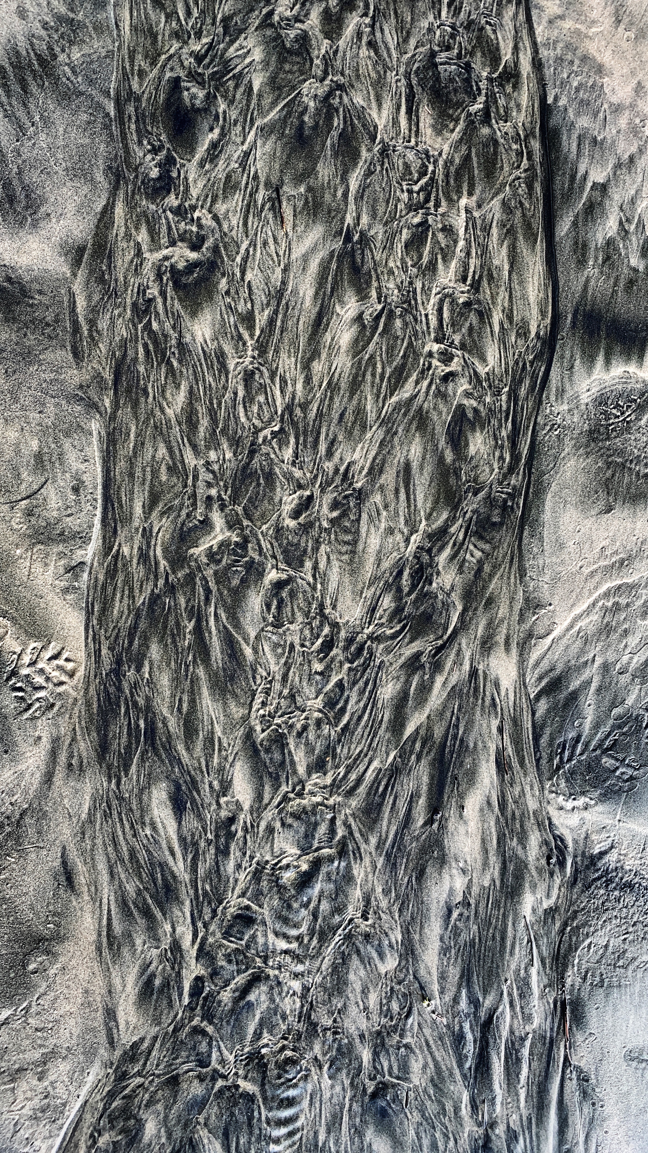 Look closely at this photo. See the faces and bones? Creatures and claws? It looks like a charcoal drawing by a surrealist artist, but it’s really a patch of beach etched by flowing water. More specifically, it’s art created in sand as a creek seeks its original source, the sea. I admire how the stream, oblivious to critics and marketplace, follows its inventive instincts one sand grain at a time. We viewers do the rest — give meaning to the abstract, find form in the ephemeral.