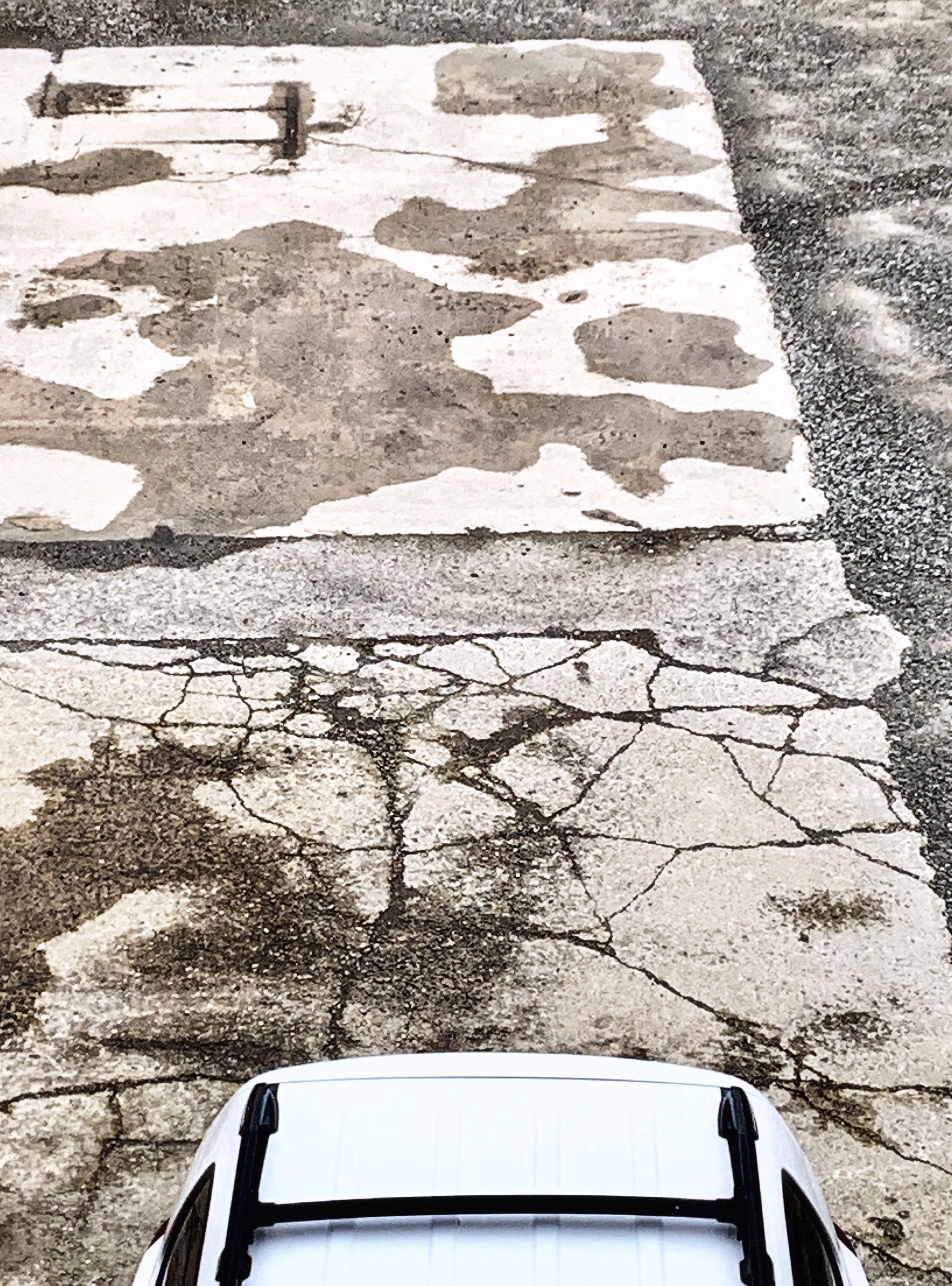 The old concrete sits cracked and crumbling. Fissures and stains criss-cross the slab — relaxing behind a warehouse built a century ago — and reveal designs carved through decades of use. Wagons and trucks unloaded here. Heavy machinery toppled here. Ice, rain, weather gnawed here. Perhaps like the lines we see in our mirrors? Faces etched by work and family, worry and joy? Evidence of life lived.