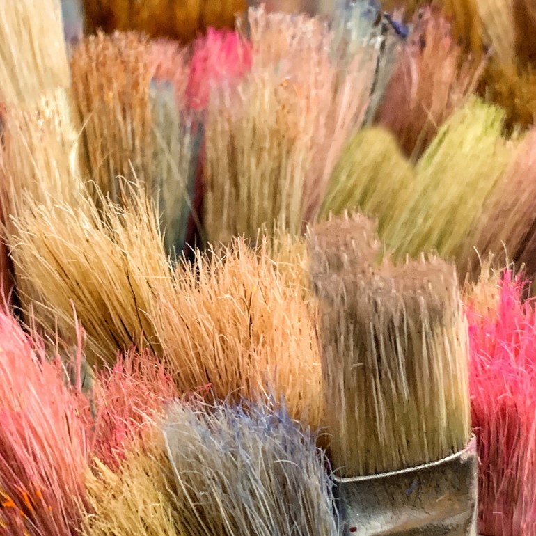 Artists leave behind more than paint on canvas. Their creative efforts touch souls long after the brush strokes dry. Asheville artist Jonas Gerard, a dynamo who reportedly paints in an ecstatic flurry, invites visitors to reap inspiration from his richly spattered studio. Colors glow from hundreds of brushes and bottles, while stray drips and daubs transform tables, chairs and walls into Pollock-like works. We see on his tools the blooms of inspiration and hued hints — possibilities — of what’s to come.