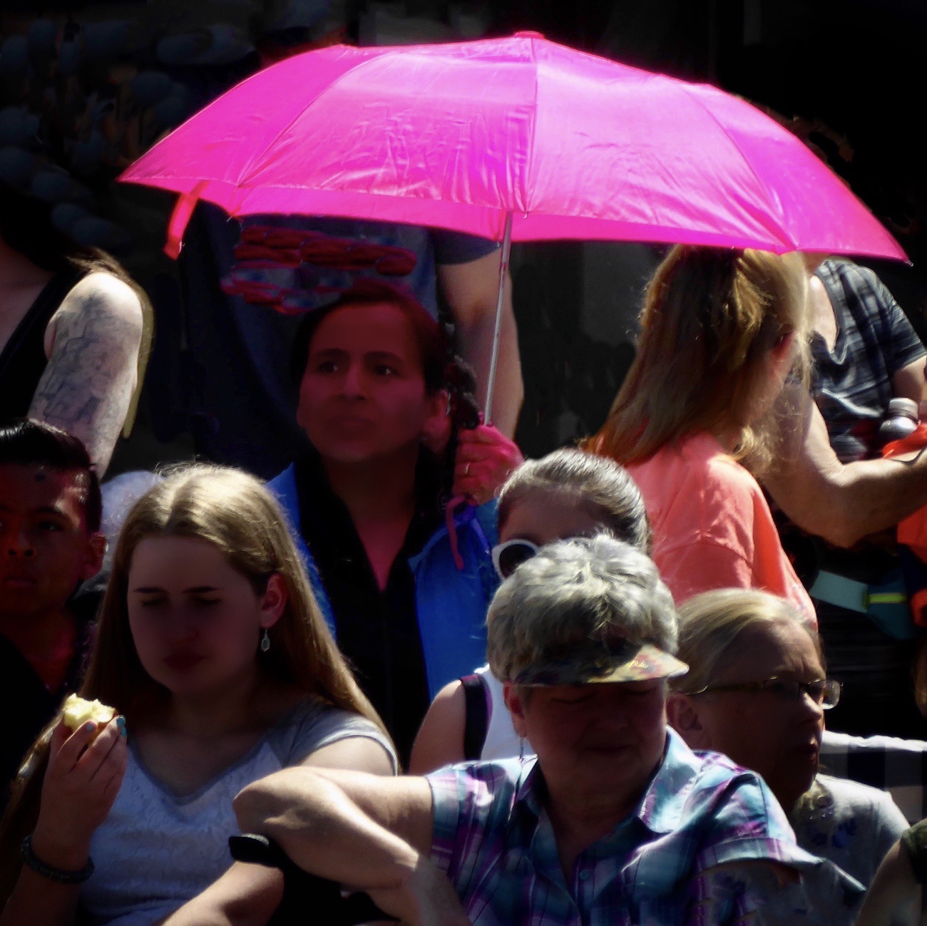 Some consider the umbrella a sign of weakness, particularly in the drippy Pacific Northwest. (“Rain? What rain?”) But I own several. Being damp or sun-scorched (as in photo) isn’t my idea of paradise. Plus, I consider the umbrella a boundary-setting device, especially on city streets. It establishes a cylinder of personal space respected by fellow pedestrians. In fact, I’m often tempted to hoist an umbrella when crowds, not clouds, are on the horizon.
