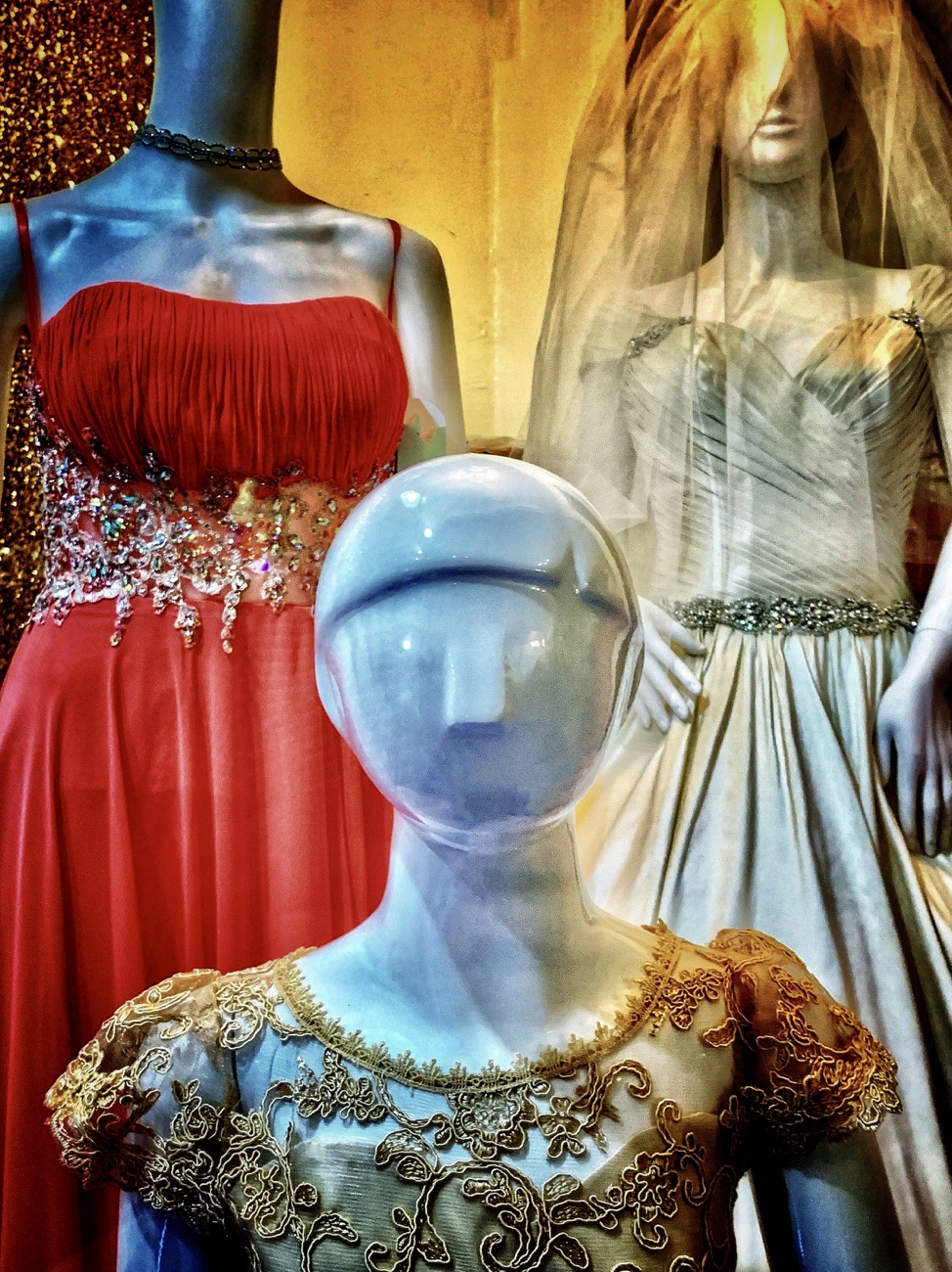 Manikins began to marry soon after the Great Emancipation of 2026. We’d place them side-by-side in a display window and, sure enough, in a day or two they’d be holding hands. Li’l Betty, our dummy for kids’ fashions, was asked to be ring bearer at the wedding of two manikins from the local hardware store. They normally dressed in coveralls and wore tool belts, so we thought they were rough-and-tumble guys. But, as you can see in the photo, they both chose lovely gowns for the ceremony to show off their feminine sides. As we’ve learned, it’s hard to tell what’s what when it come to manikins. We once had a dress form run off with one of those “articulated” models. Lord knows what they do in the storeroom. But that’s retail for you — every day comes with its own surprise.