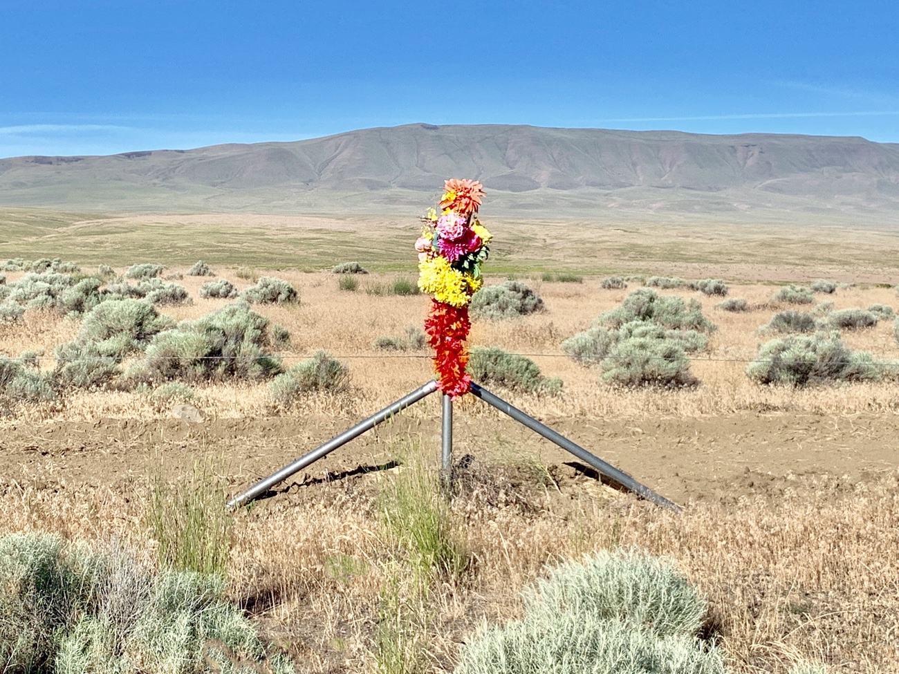 The artificial flowers shout amid the miles of sandy scrub. No epitaph on the pole, but bright blooms definitely deliver the message: “We remember.” I slow at such roadside tributes to figure out how the crash occurred. Asleep at the wheel? Too fast on a curve? Deer out of nowhere? Or was the vehicle’s driver marveling at the surrounding landscape, attention drawn for a split second to the seemingly infinite vista? Infinity to calamity to eternity. R.I.P.