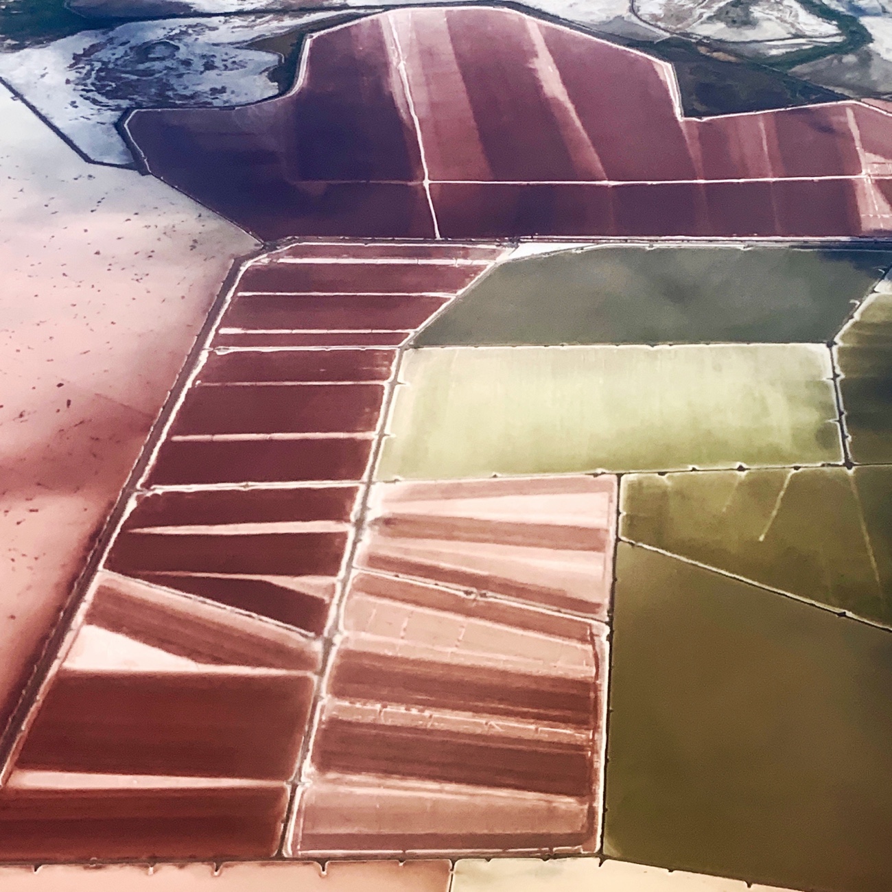 [In photo: Evaporation ponds on the banks of the Great Salt Lake are colored by algae and minerals. Picture taken from window seat while flying at — I’m guessing — about 10,000 feet.]