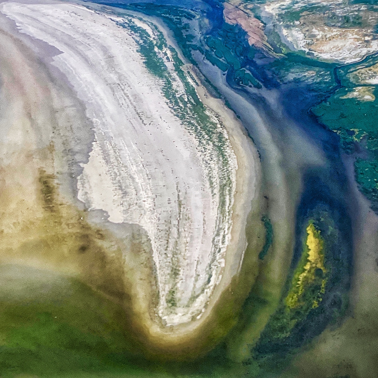 [Photo: A sandbar in the Great Salt Lake shapes multi-colored channels and bays.]