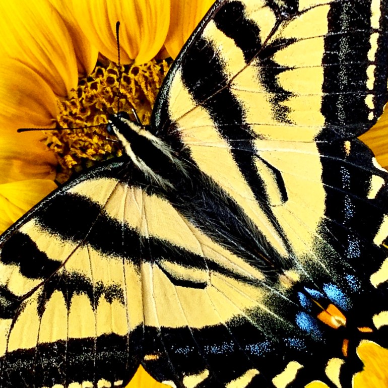 At a recent family reunion, my attention was so focused on my brother-in-law’s delicious jambalaya that I didn’t notice a cousin taking photos of me shoveling it in. There I was — caught with my mouth full of rice and sausage, as if preparing for widespread famine. So I’m not surprised this butterfly continued slurping at a sunflower rather than flit away. I imagined it ate with eyes closed, cheeks puffed with nectar, little napkin tied around its neck. In this world of constant distraction, such pinpoint awareness is a rare gift. Not so much gluttony, really, as utmost fulfillment.