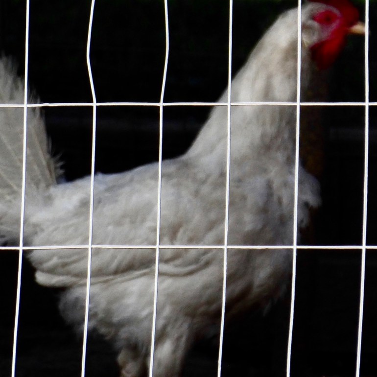 Shapes in wire fences often corral my attention. The squares, rectangles and hexagons create an overlay on reality — a grid — that allows me to focus better on segments of a scene. A door knob, a bike wheel, a neighbor’s sunglasses, the comb of a clucking chicken. A fence’s wires isolate details, sharpen my vision and engage my thinking. Sadly, they do nothing good for the chicken.