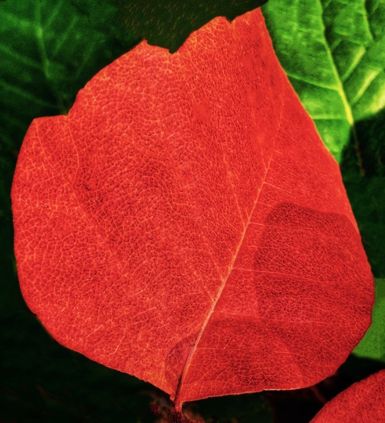 With chlorophyll gone, this leaf’s true face emerged bright red and beautiful. It was always there, but hidden behind the green facade of photosynthesis. Buddhists refer to such a countenance as the original face, the one worn as an infant before society’s imprint. That face in adults is often veiled behind fear, pride, judgment and ambition. The sage advises peeling away those layers through acts of mindfulness and acceptance — “right now, it’s like this” — and allow our real face to smile in the moment. Not an easy task. Even the leaf quakes with the effort.