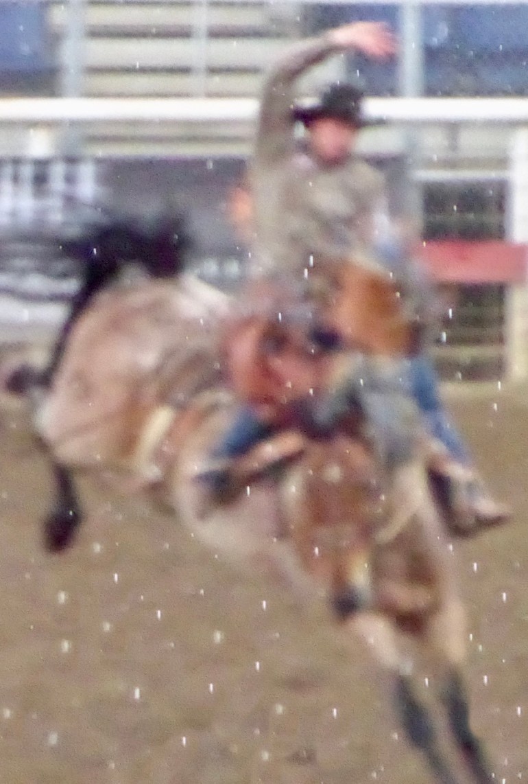 Rodeo #2 | Drizzle intensifies the scent of lariats, leather and livestock. As one female rodeo fan yelled, “Hoo-wee! Do I smell wet cowboy?” Bronc busters and bull riders aren’t fazed, of course, by sporadic sprinkles. When you’re straddling a 1,500-pound dynamo, rain and the resulting aromas are the least of your concerns. It’s the spectators — some in $300 hats, some in $4 t-shirts — who scramble for shelter. I speak from recent experience: Not every rodeo buff smells nice and sweet when dripping wet.