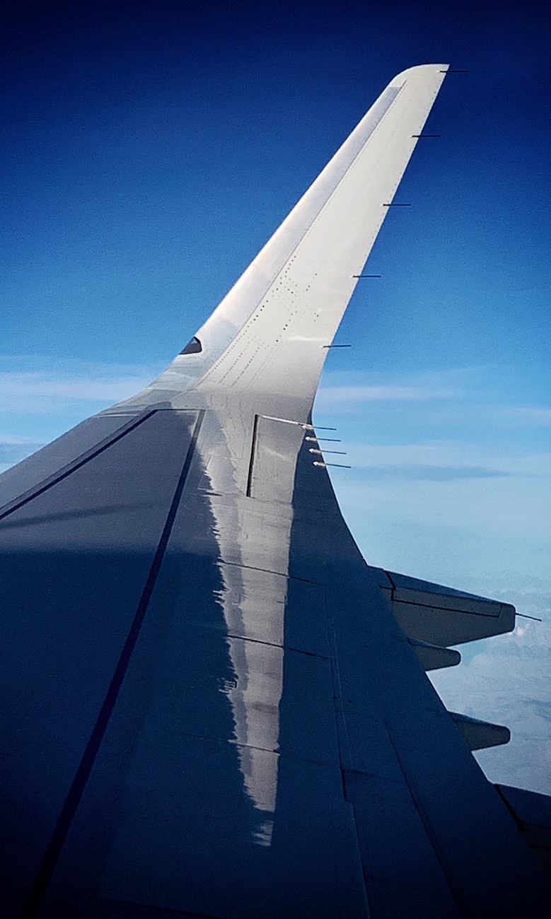 Window Seat #2 | Upturned fins, called winglets, at the tips of jet wings blend airflows of differing pressures that could cause turbulence. I like them because they look cool, rather rakish. I’ve always thought it’d be great to have some kind of winglet to ease everyday turbulence, such as squabbling over who mows the grass or bickering about the price of a used car. Maybe a baseball cap with jutting airfoils? Thankfully, we have social winglets — “please,” “thank you” and a smile — to make our glide through life a bit smoother.