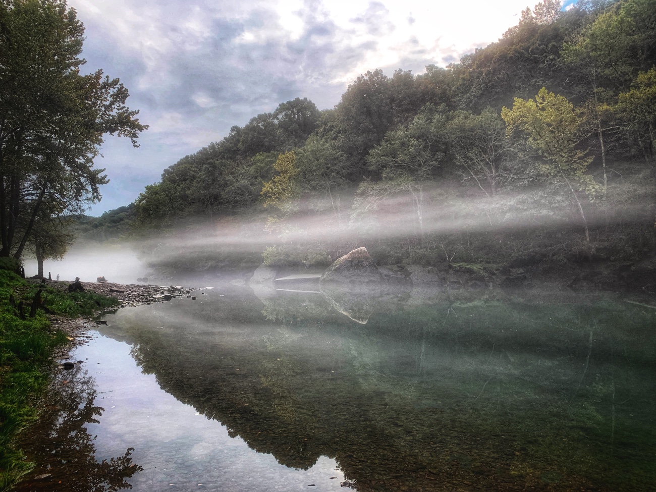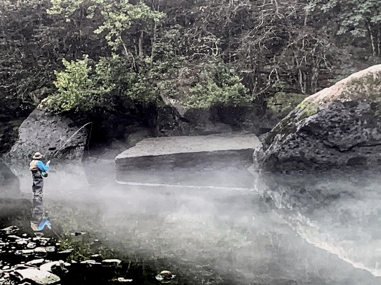 Travelogue #1 | Mist rises from the Little Red River, one of Arkansas’ top trout streams and a great place to hang out until our favorite catfish shack opens for lunch. That’s my brother wetting his line in pools below two landmark boulders. Not many bites, however, as morning temperatures were in the 80s and later would hover near 100. Don’t even ask about humidity. Let’s just note that the inside of my brother’s waders were getting squishy with … eww … sweat.