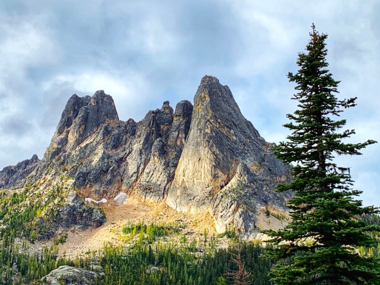 Last week I joined two bus loads of German tourists to watch in reverence as sunbeams played across the face of the Liberty Bell Group. (That’s Liberty Bell Mountain on the right, Early Winters Spires on the left.) It’s not easy to muffle 120 chittering travelers — no phones, no gossip, no tour guide lecture — but this geologic marvel did just that. We stood silently enough to hear raindrops in the evergreens and wind on a distant ridge. I don’t speak German; they didn’t speak much English. But for a few minutes we all understood the elemental language that whirled around us.