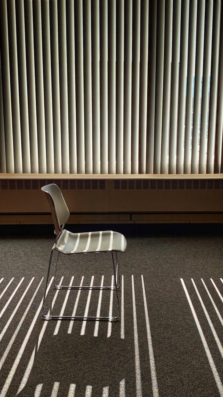 The library room where the kids’ story hour takes place is mostly empty now — one chair and illuminated reminders that light travels in a straight line. The strips emphasize the room’s geometry: Parallel bands in a cube of quiet. I squat low to feel the warmth of sunlight’s arrival. All’s still and silent, until … Crunch! I turn to find a young woman sitting on the floor in the corner, big coffee-table book spread open, bag of potato chips within easy reach. “Oh, sorry,” she says, munching. Then: “You seem really interested in the floor. Are you, like, the carpet guy?”