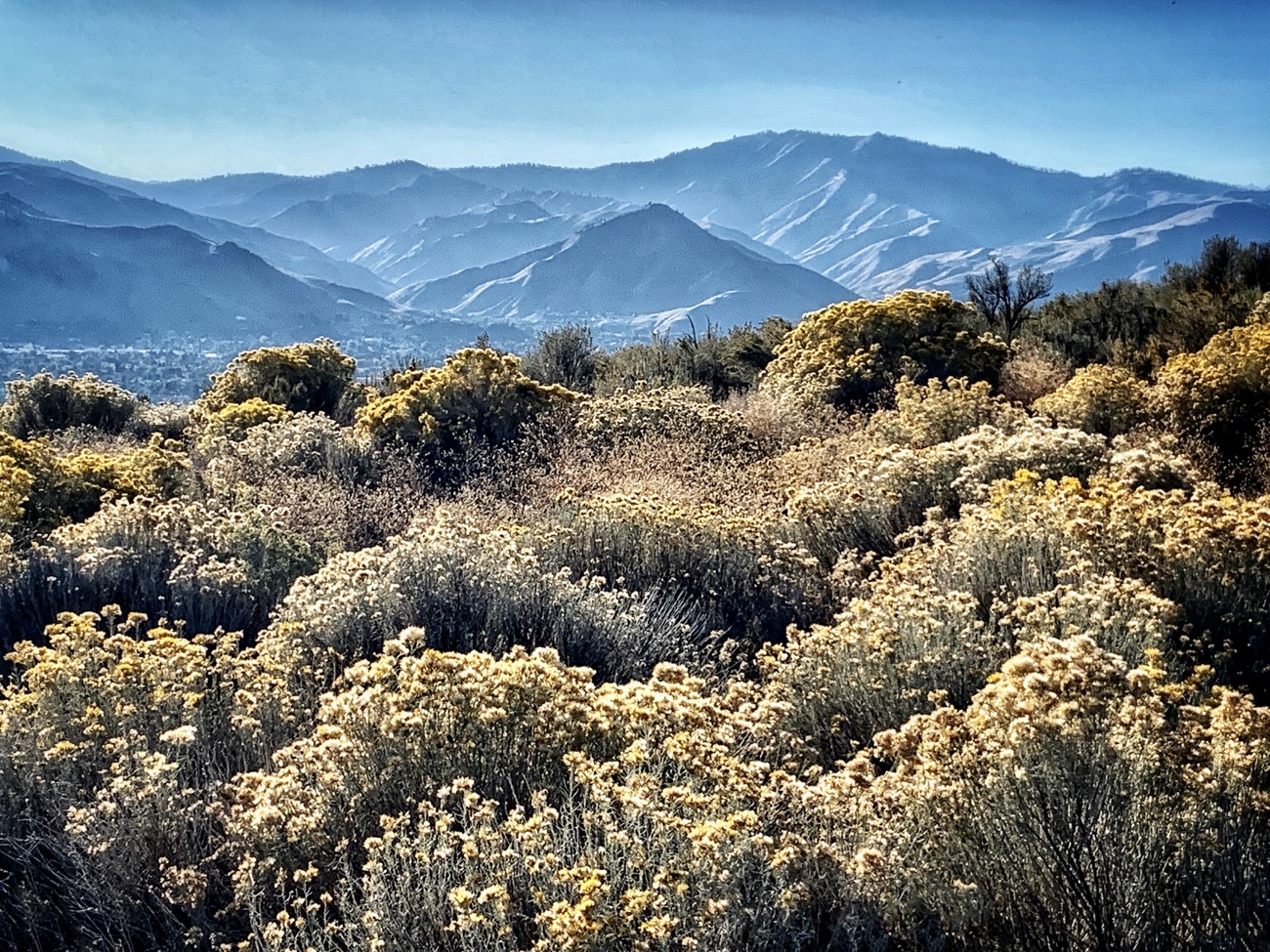 [In photo: Shrub-steppe in autumn bloom with Cascades foothills in the distance.]