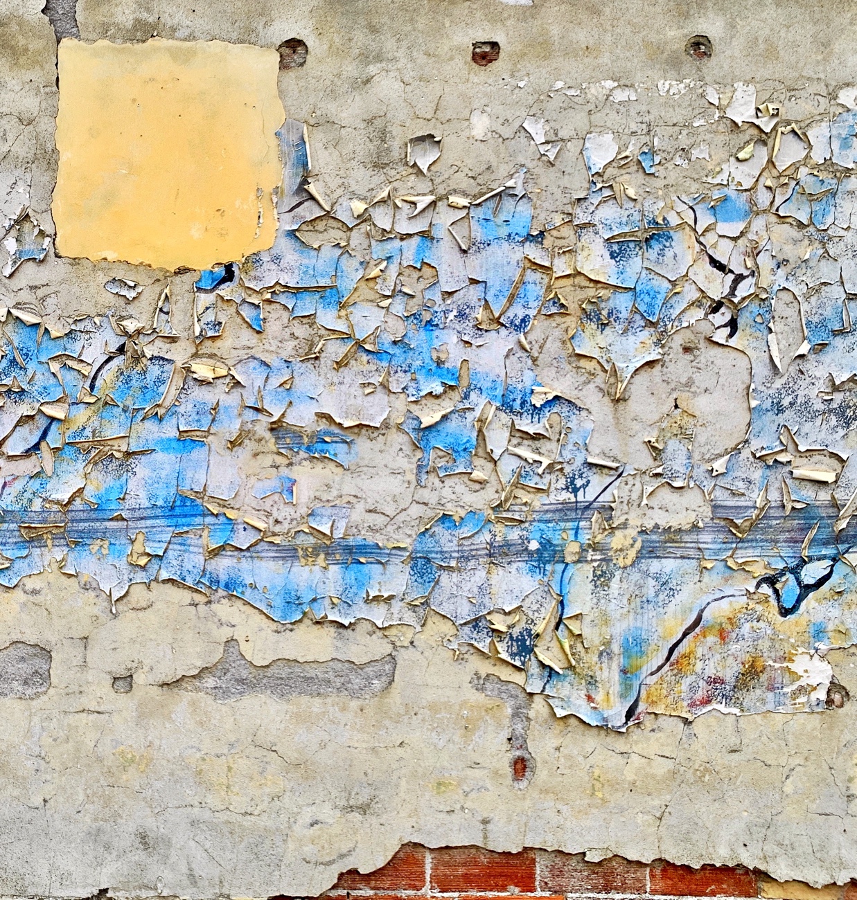 [In photo: Peeling paint and paper suffer the elements on a building in downtown Soap Lake.]