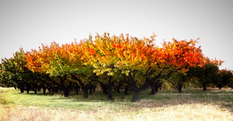 Autumn Orchard #1 | Orchardists talk passionately about fruit color and quality, irrigation and pesticides, difficulties in hiring and keeping workers. But I’ve never been privy to a fruit farmer exclaiming over an orchard’s autumn colors. “It’s so darn beautiful,” the grower might say. “Those golden leaves, that shimmering light … it makes all that sweat and worry very much worthwhile.” Or not. I’m guessing there must be other rarely-discussed autumn perks — the scent of ripened fruit, all the apples you can eat and a satisfying, post-harvest stillness. Imagine: A grower stands at season’s end in silence, in gratitude, among her resting partners, the trees.