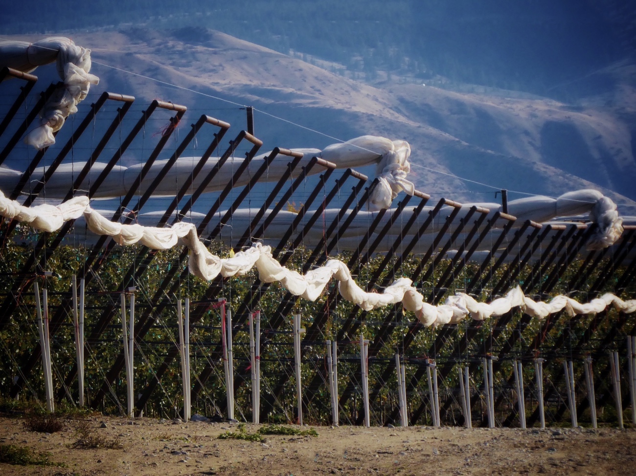 [In photo: Huge sheets of netting that protect fruit from sun, wind and pests are rolled at season’s end.]