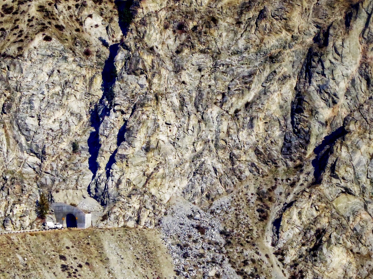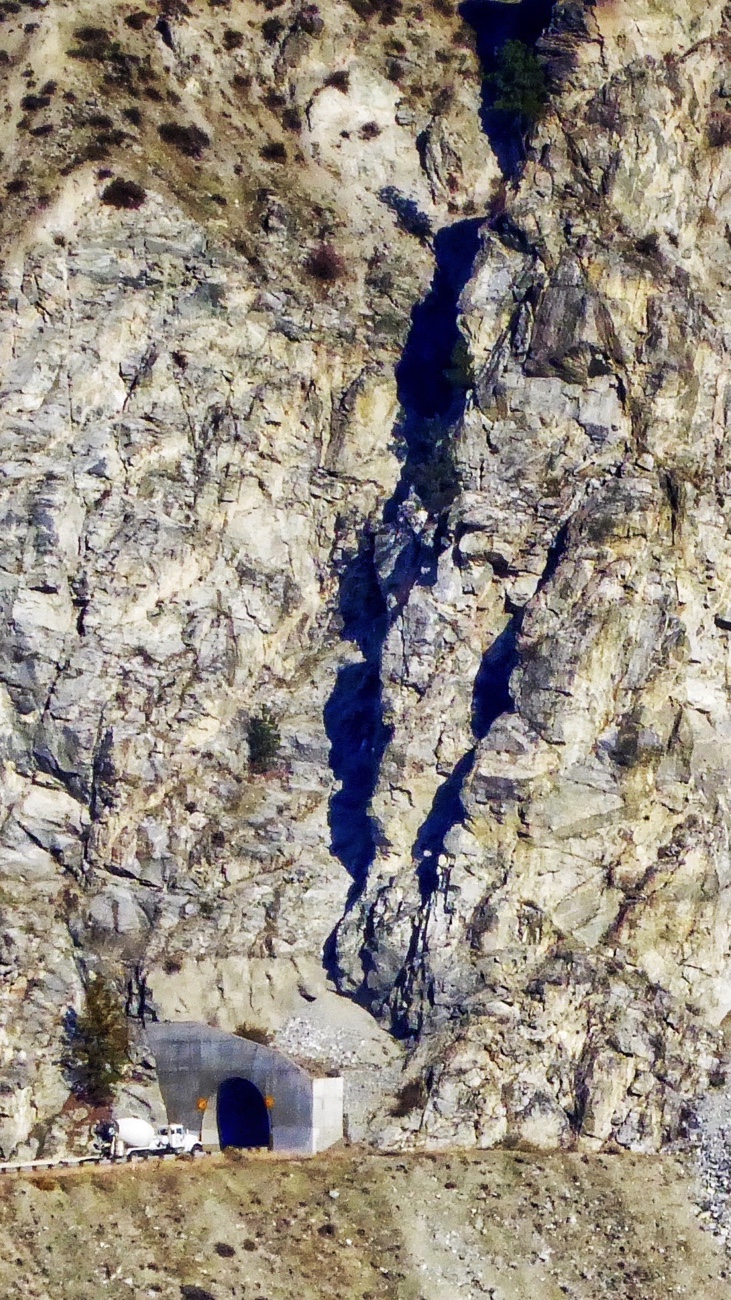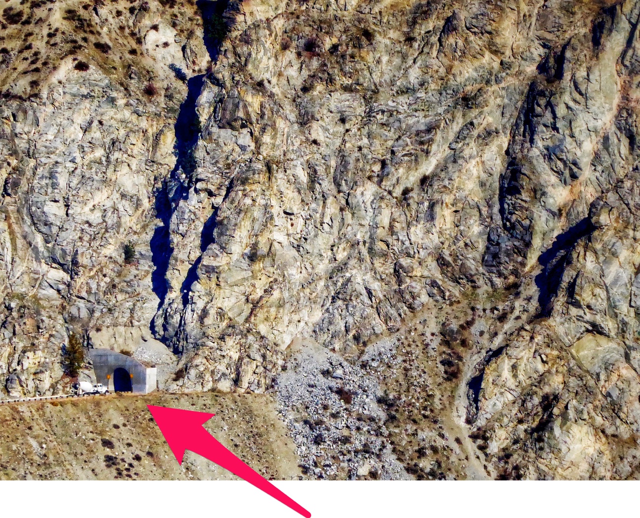 [In photo: Knapp’s Hill Tunnel is on Highway 97A south of Lake Chelan and above the Columbia River.]