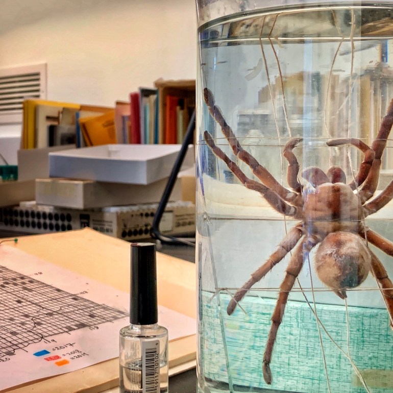 [In photo: A huge multi-legged critter (arachnid? crustacean?) overlooks a biology workspace at the Burke Museum.]