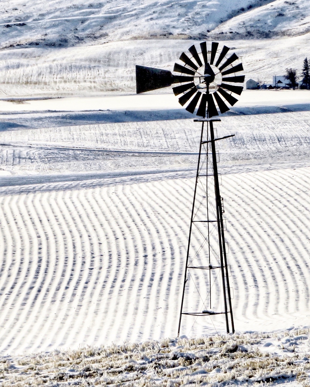 A windmill on a dirt track is sometimes the only hint of humans in isolated areas of the Waterville Plateau. No houses, no cultivated fields, no phone service. Just you, the windmill and an occasional creak from metal on aging metal. Nowadays many of these bladed gizmos stand locked in place, resting and rusting. For me, these vertical structures tie ground to sky and past to present. I’m amazed that for decades they converted the invisible (moving air) to the mechanical (pumping water). They’re darned photogenic, too.