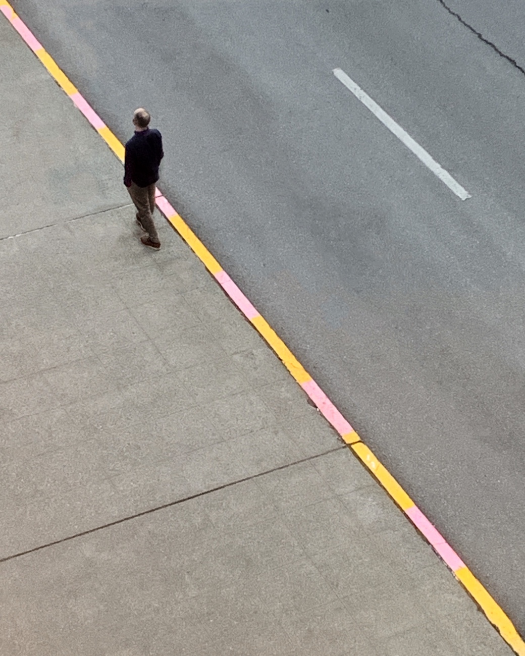 A surprise for the eyes lies almost everywhere in the big city. Lines, shapes, colors, fullness, emptiness and, oh yeah, people. One pleasure is to peer out a high-rise window with no notion of what’s below. Streetscape, sure, but maybe also an unfolding mini-drama. Such as: Cops chasing a crook, a parade of pooches or a man lost in thought at the curb. These folks rarely look up and will never really know how much delight they delivered to the guy at the window.