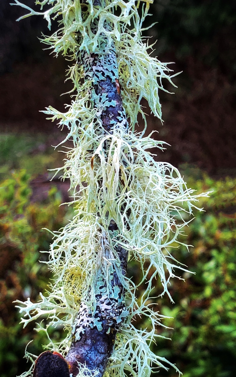 At least I think this is lichen. It hangs on younger trees growing in partial shade not far from the beach. Perfect conditions for lichen’s symbiotic mix of fungus/algae to flourish.