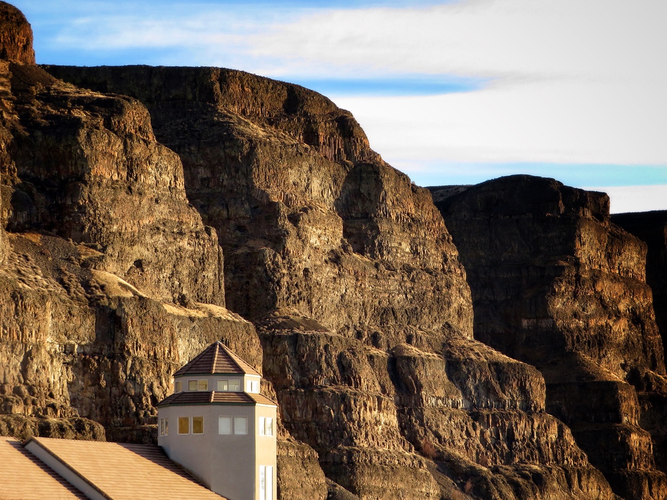 [In photo: Basalt cliffs rise above the community of Crescent Bar, a recreation spot on the Columbia River.]