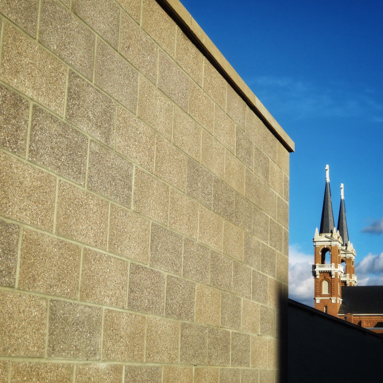 Wall #1 | Church spires beckon in the distance, but I linger in the lee of a cinder block wall to escape the winter wind. The wall radiates warmth and smells of kitchen herbs, and I’m not sure the church will be as soothing. In fact, the statue of a genuflecting angel in the building’s nave — a gesture of welcome to visitors — makes me uncomfortably twitchy. I prefer my supernatural beings less earthbound and more glorious, more on high. Regardless, a blast of frigid air veers around the wall to send me on my way — towards the church and whatever mystery I might find.