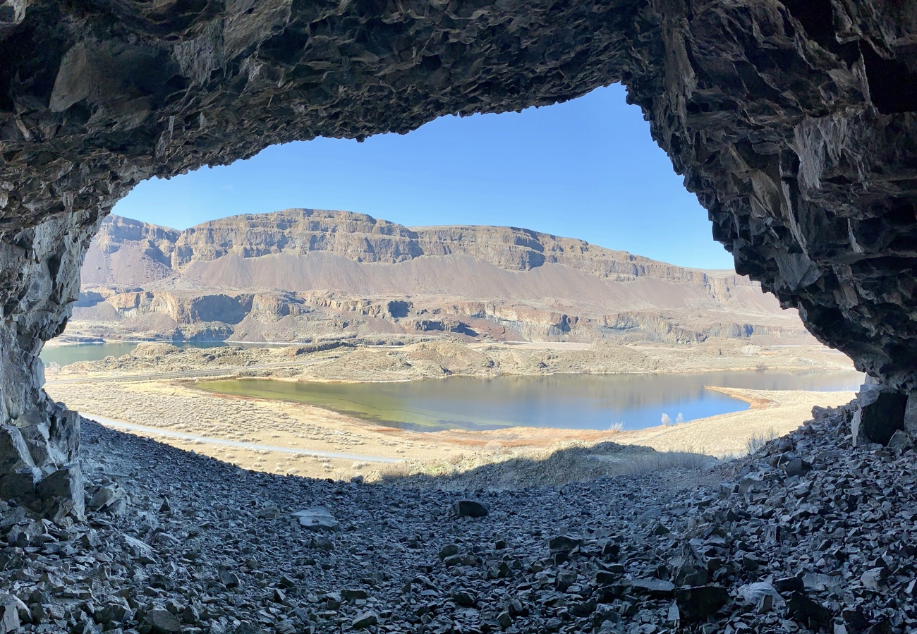 [In photo: This panoramic shot from inside Lake Lenore Cave is a bit deceptive. The cave’s mouth is broader, more open, than depicted here. In fact, the cave is actually a deep recess rather than an in-mountain cavern.]