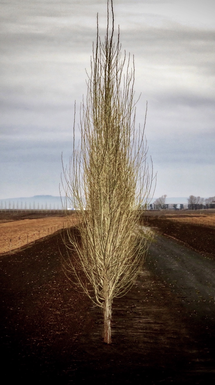 [In photo: The first tree in a long windbreak at Willow Drive Nursery. To see cosmic design in a sliced strawberry, click here.]