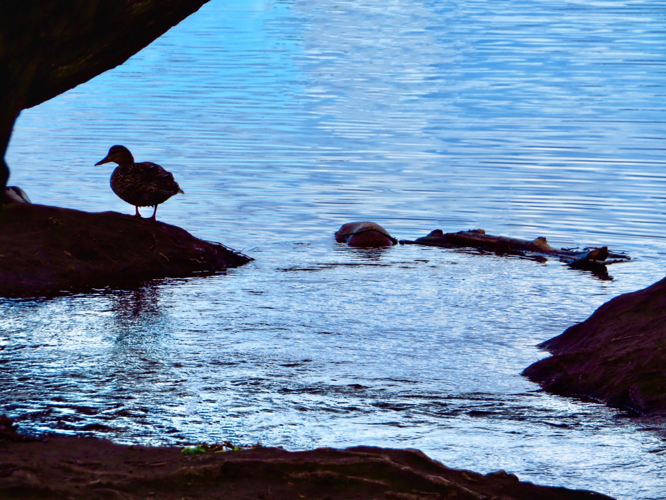 Ducks always seem a bit self-absorbed. They curb their emotions: No high fives, victory dances or other exuberant displays. Sometimes in a flock they’ll quack displeasure — “Webbed feet! Is anything more disgusting?” — but otherwise they’re unflappable. This particular duck, deep in thought, stood for long minutes at river’s edge. “What value lies in fighting the current? Wouldn’t I be happier drifting effortlessly, following the flow?” His expression gave no clue as to what he might do.