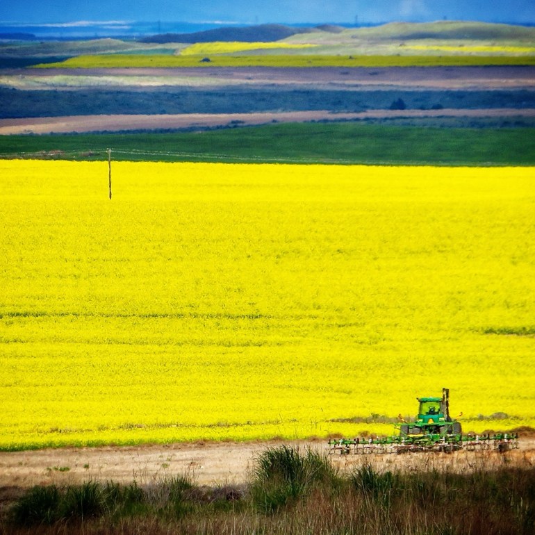 I’m no farmer (barely even a backyard gardener) but I’d like to heartily endorse rapeseed as an alternative crop for wheat on the Waterville Plateau. My enthusiasm has little to do with the crop’s usual byproducts — biofuel, cooking oil, livestock feed, soil enhancement — and more to do with visual aspect: It’s pretty. Fields of rapeseed flowers add daubs of yellow to the landscape’s usual greens and browns. The blooms are particularly brilliant in contrast to house-sized erratics deposited millennia ago by glaciers. And the blossoms’ yellow-greenish hues fully complement the trademark colors of harvest equipment. As my artist friend Jeffrey once said after smearing yellow across his plateau painting: “It works.”