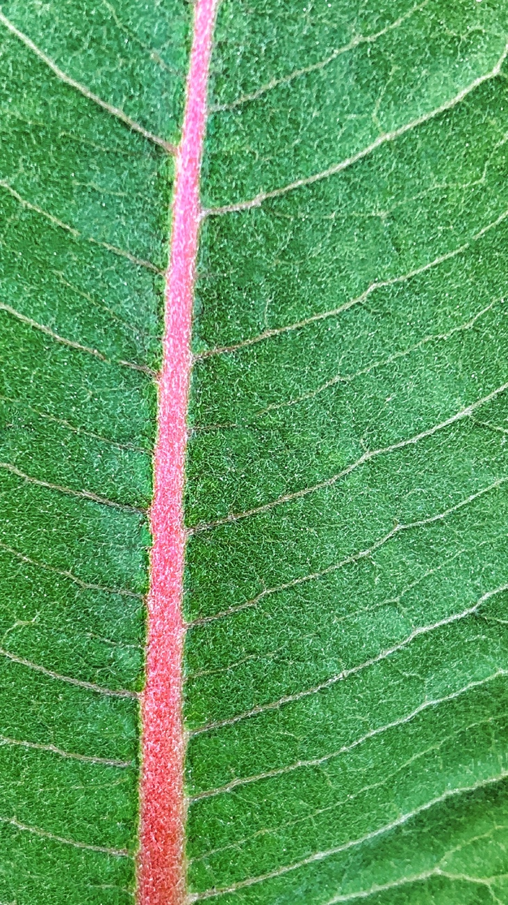 [In photo: A rhubarb-like midrib on the leaf of a riverside weed.]